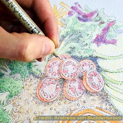 This term, we’re taking Drawing Fundamentals to the kitchen! However, instead of utensils and a kitchen sink we’ll be using watercolour pencils and lots of ink! With a variety of fine-liner ink pens, watercolours and intricate shading techniques, we will learn how to artistically construct a detailed and colourful plate of our most precious food ingredients. Drawing food items is a versatile way to teach the core elements of art as food provides diverse textures, vibrant colours and complex, organic/geometric forms. We’ll also touch upon value (shading), line, space and composition as we create a dish that’s sure to inspire hunger in any viewer!
